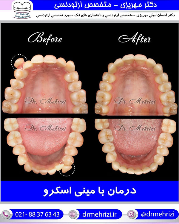 همراه ارتودنسی ثابت برای عقب بردن دندانهای فک بالا (دیستال درایو) از دو عدد مینی اسکرو کمک گرفته شد.